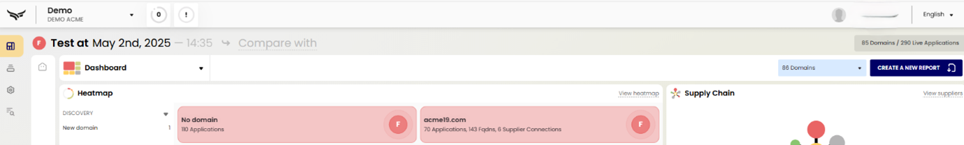 You can export reports at a project level, business unit level, or domain level. Use the heatmap view to focus on the information you want to include, then click on the Create A New Report button in the top-right corner.