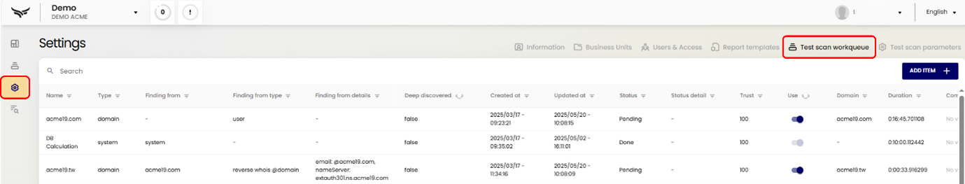 From the Dashboard (which is where you’ll land after logging in), click the Settings Icon in the left-hand navigation panel and “Test scan workqueue” from the top menu.