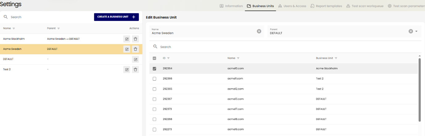 - Settings - Where you can manage business units, project information, members, report templates, workqueue items and scan parameters.