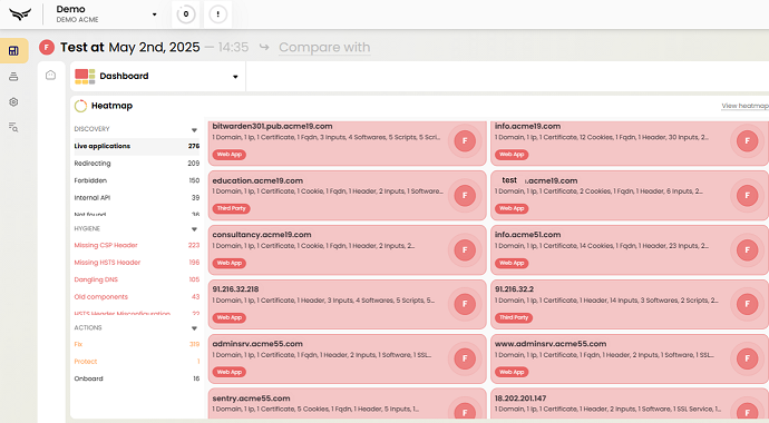 Digital asset discovery across your organisation starts with scanning.This provides visibility across your total external attack surface, comprising all your organisation’s managed and unmanaged infrastructure and applications. It automatically detects domains, IP addresses, certificates, software, and other key assets.