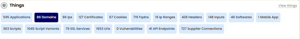 Clicking on the “Related Things” tab in the upper right provides a full list of everything discovered that relates directly to that application (FQDN’s, certificates, IPs, URL’s, software etc). Columns in this view include: