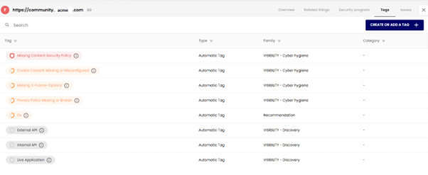 Under “Tags”, users are presented with a list of system-generated tags related to cyber hygiene and discovery, and also have the ability to create custom tags themselves.