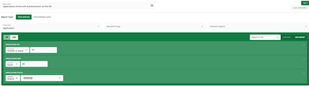 Add rules: applications with authentication greater than 50 and application status = online, and application port = 80 (see screenshot below).