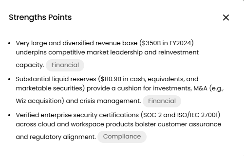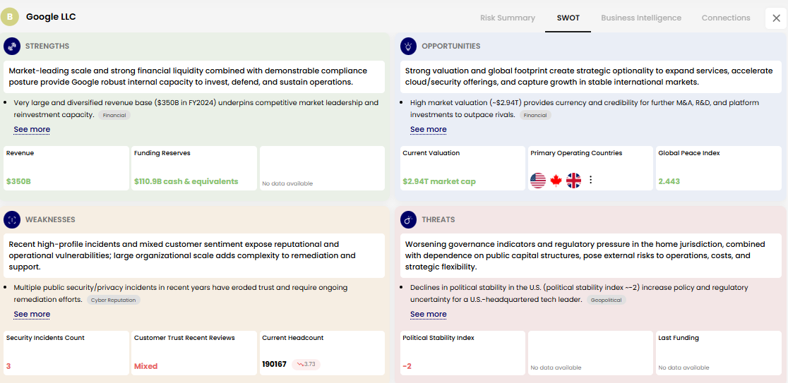 Once a supplier is subscribed to, the SWOT analysis becomes available and updates continuously. Each quadrant includes a high-level summary, with pop-ins providing deeper contextual information.