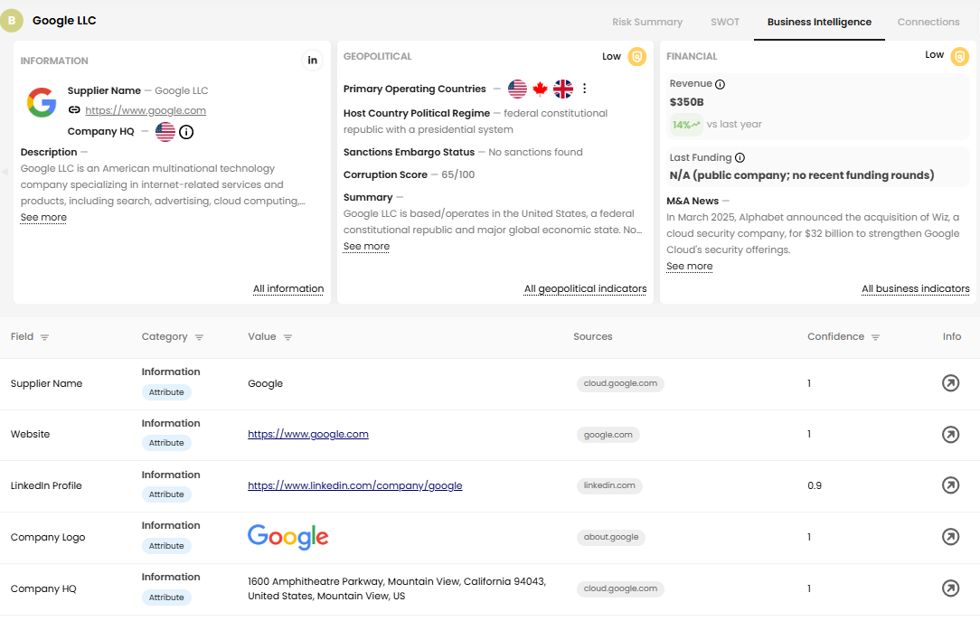 The Business Intelligence tab displays verifiable data points across corporate, geopolitical, and financial domains. Each data entry clearly cites its source and includes an assigned confidence score (0–1). Users can filter entries by field, source, category, value, and confidence level. Pop-ins offer expanded information for each item