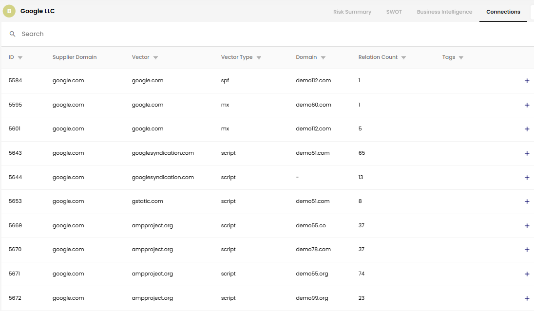 The Connections tab highlights digital relationships derived from supplier activity. Columns display details such as: